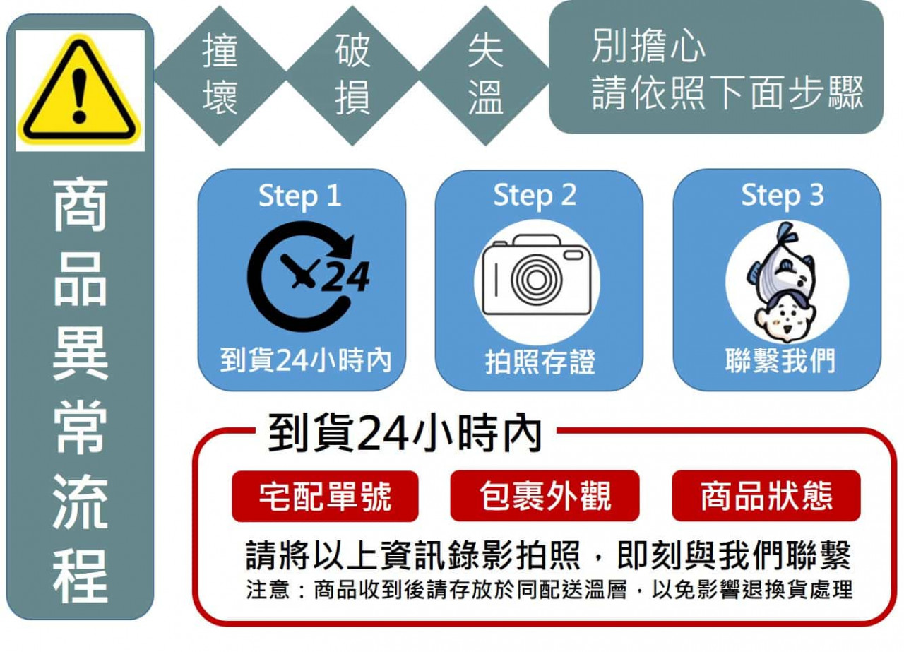 當商品送達時,請儘速確認您所訂購的商品,若有非人為因素的瑕疵(商品損毀、刮傷、或運輸過程造成包裝破損不完整的情況)或異常解凍的情況(表面稍微解凍純屬正常現象),請您立即向宅配客服 02-412-8888 反映、拒簽、退回並請提供訂單編號、大名、電話,將瑕疵商品拍照Mail至pangmeow16@gmail.com或粉絲專頁,客服將協助您後續處理。